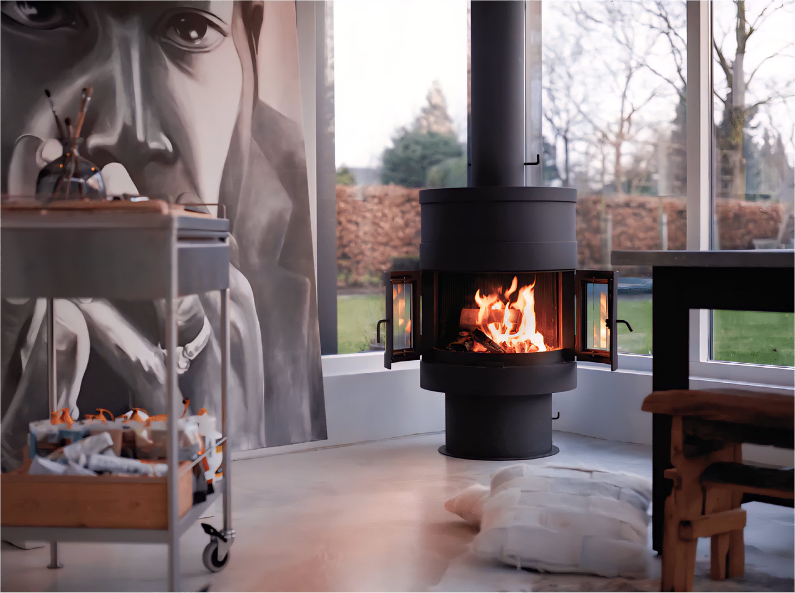 The Boley 993 is a rotatable, free-standing fireplace designed for both indoor and outdoor use. Available in wood or gas versions, it offers 180° rotation for flexible positioning. With its sleek matte-black finish and robust build, it adds both warmth and modern design to any living room or garden.