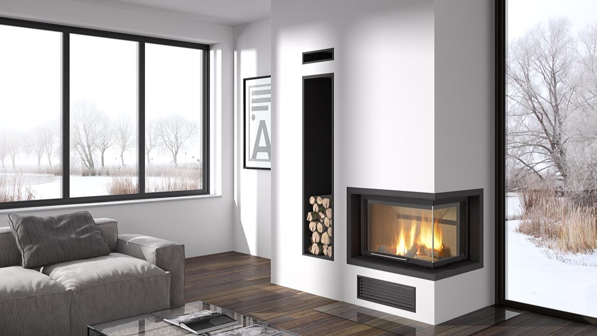 Firebox with sliding up-down door, lateral view, in two sizes 300 and 450. With a wraparound casing with optional, air conduction and an ash pan removal from above or below.