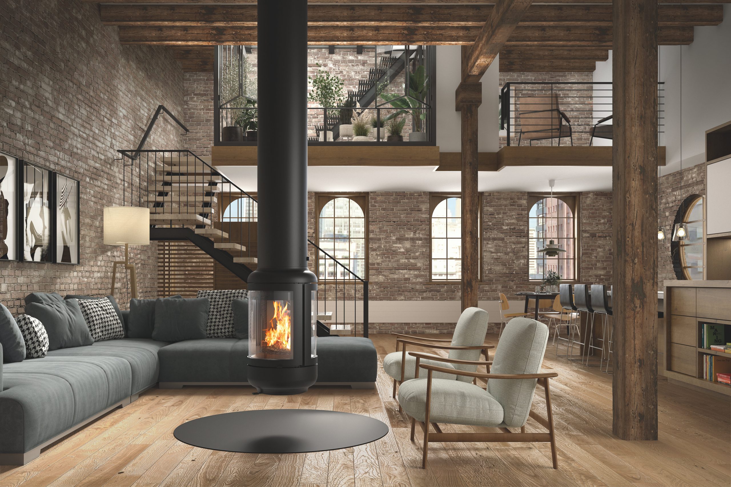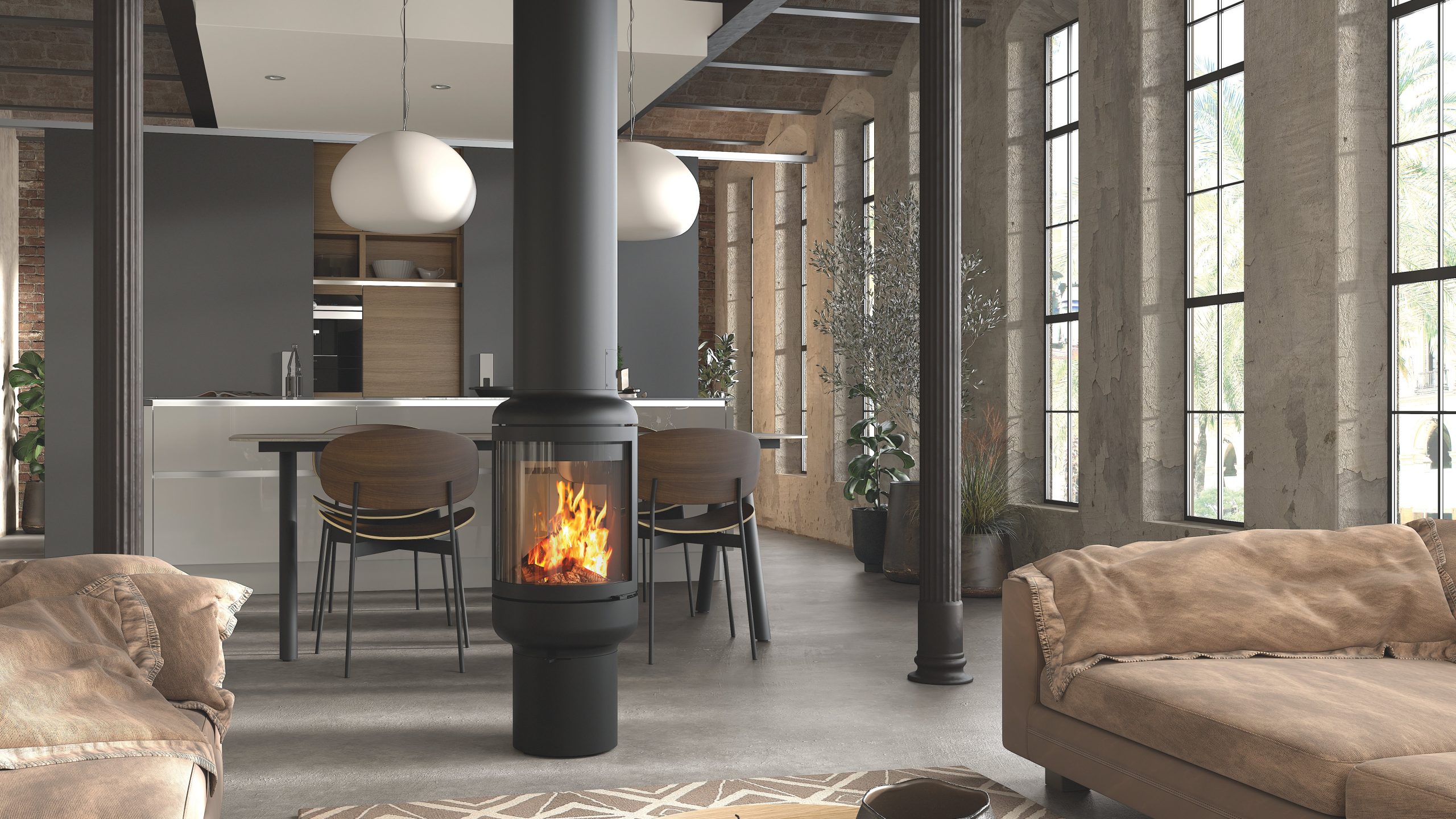 The Rocal Vesta Central is a striking cylindrical central fireplace engineered to feature fire from all angles. Designed for medium-sized spaces, this freestanding model boasts panoramic 360° glass visibility and is built with precision-molded iron for a sculptural presence.
